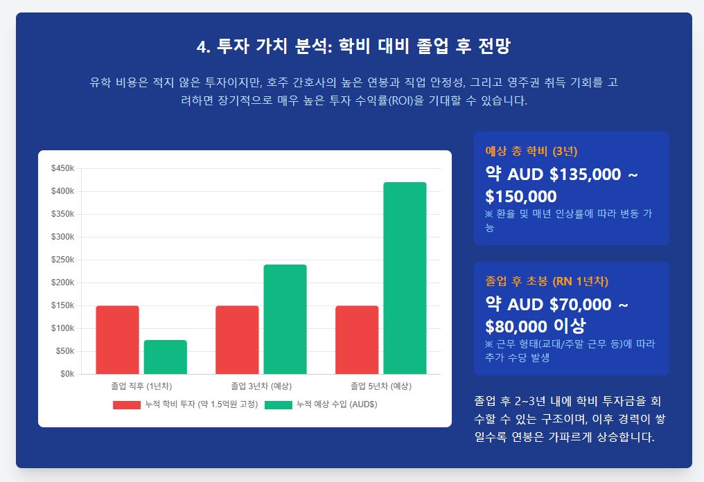 - 졸업 후 초봉: 약 6,500 ~ 7,000만 원 (호주 RN 1년 차 기준)