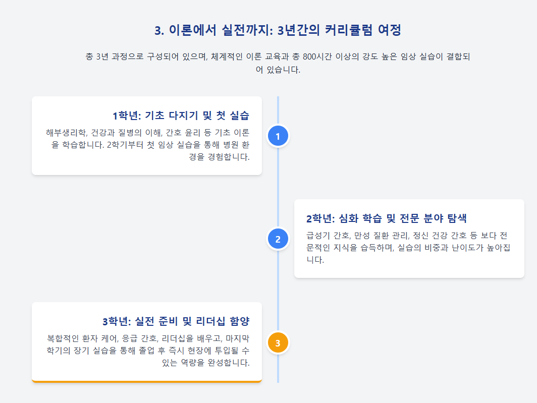- 3학년: 응급실, 지역사회 간호 등을 배우며 마지막 장기 실습을 통해 실전 감각을 완성합니다.